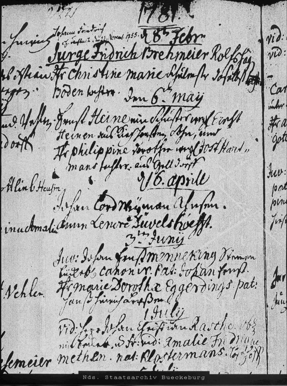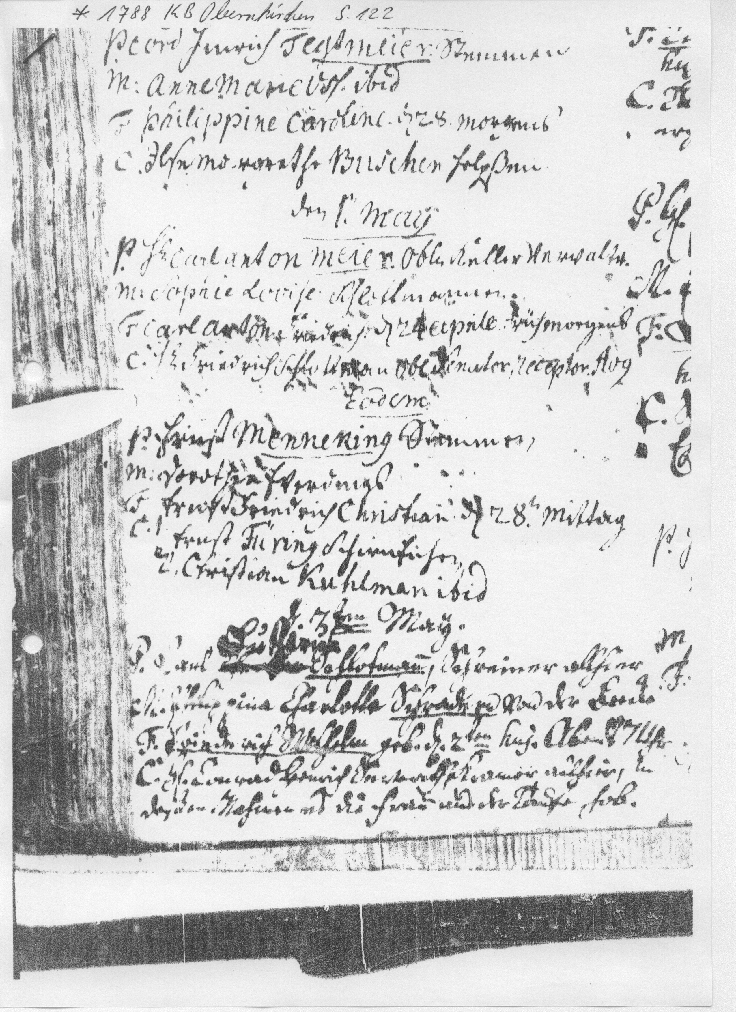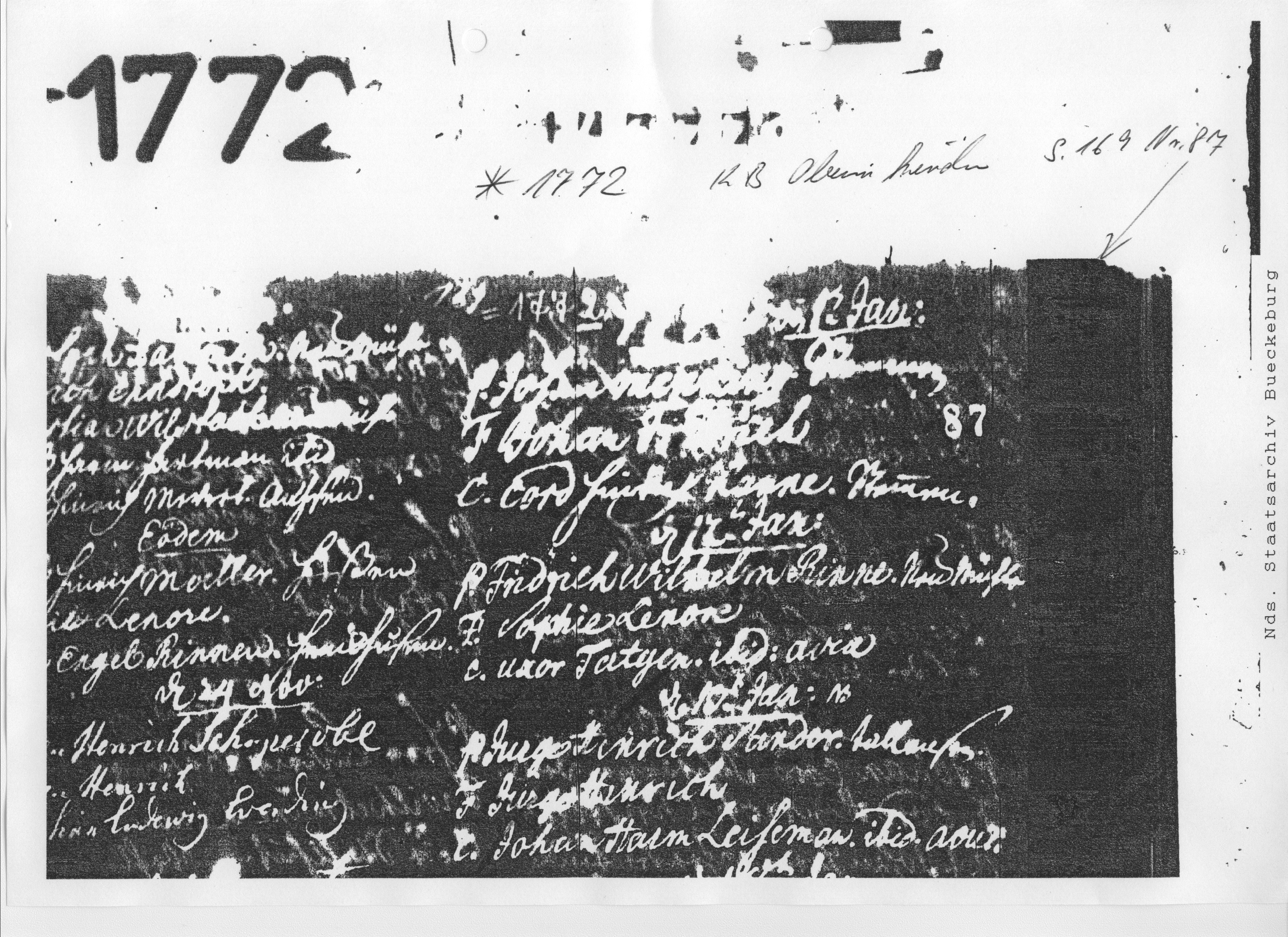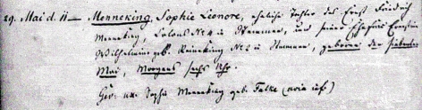 Patinnen: Dorothea Elisabeth Menneking und Sophia Margaretha Eggerding Großmütter aus Stemmen.17. Menneking, Ernst Friedrich Christian, * Stemmen, Niedersachsen, Deutschland 28.04.1788, ~ 01.05.1788, † Stemmen, Niedersachsen, Deutschland 31.05.1853