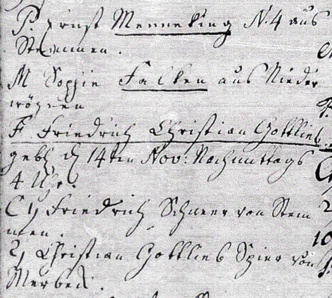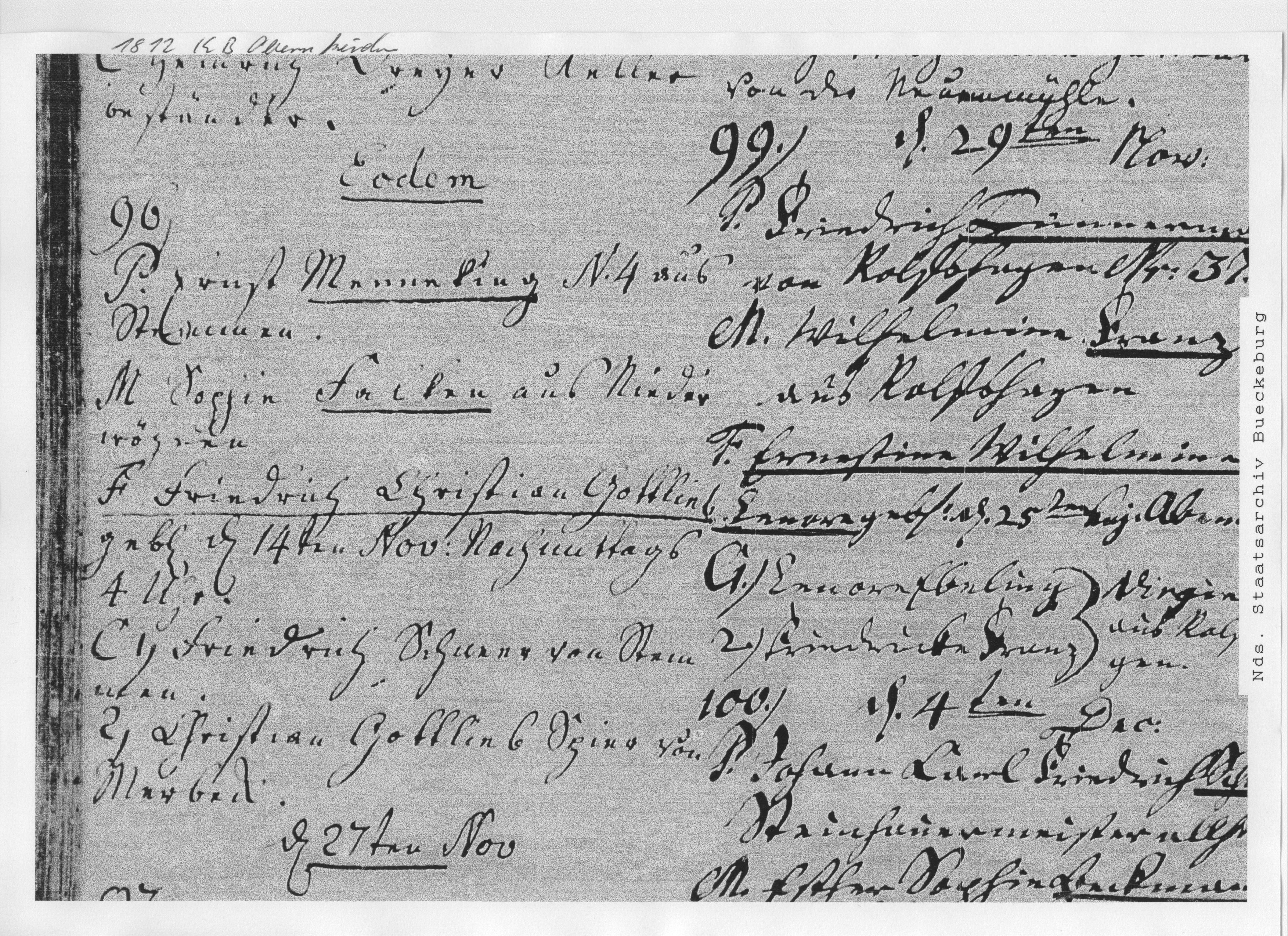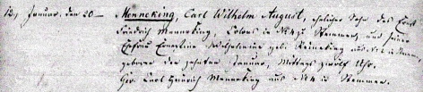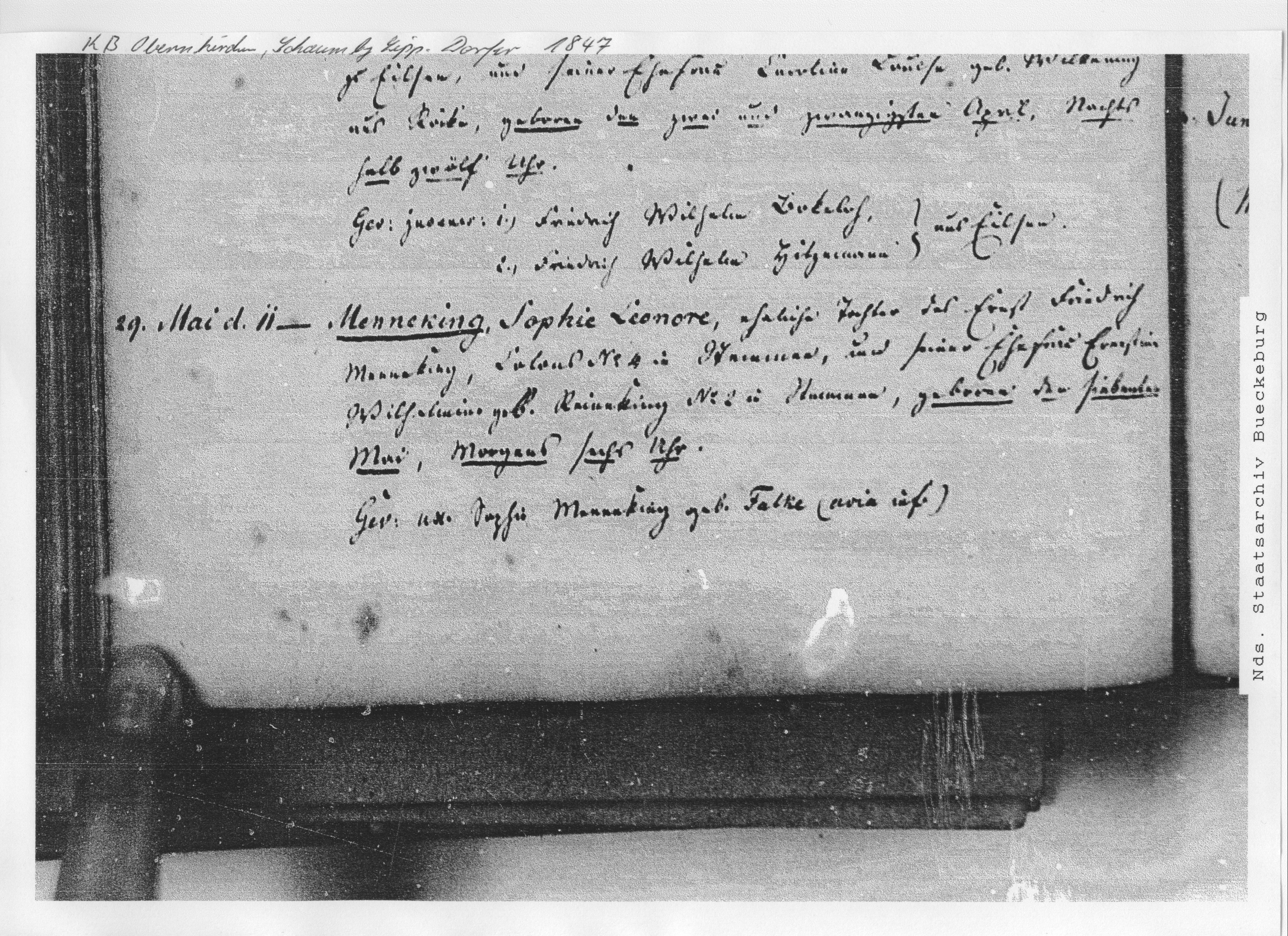 oo Catharina Sophie Wöbbeking, † 08.04.184620. Menneking, Friedrich Gottlieb, evangelisch, * 08.11.1821, ~ Obernkirchen, Niedersachsen, Deutschland 18.11.1821