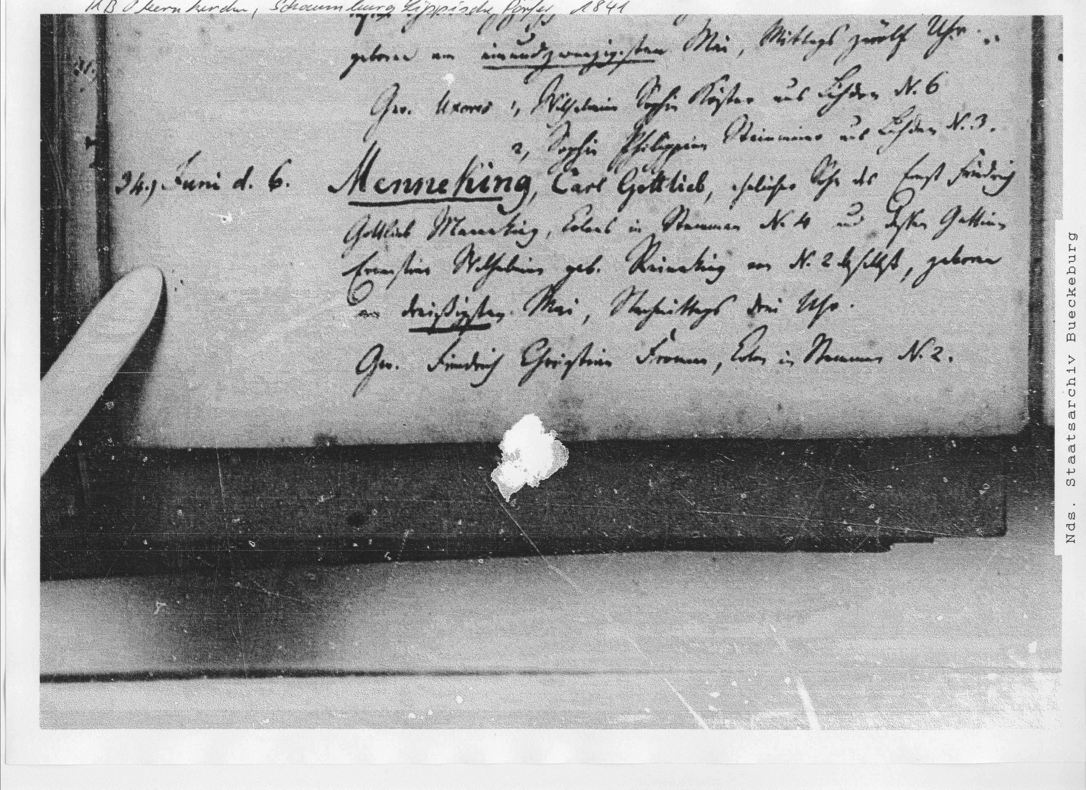 oo I. Obernkirchen, , Deutschland 08.03.1835 Ernestine Wilhelmine Reineking, * Stemmen, Niedersachsen, Deutschland 29.09.1812, † Stemmen, Niedersachsen, Deutschland 13.10.1852, II. 27.11.1853 Caroline Ernestine Eleonore Dreyer19. Menneking, Friedrich Christian Gottlieb, keine, * 14.11.1812
