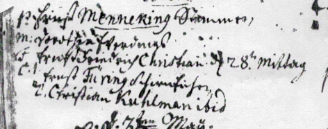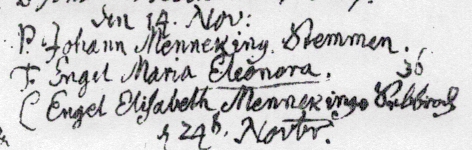 Joh. Mennking wird 1740 als Colon auf Stemmen Nr. 4 gelistet.oo Sophia Elisabeth Menneking 1 Kind von Nr. 6 8. Menneking, Anna Sophie Margrete, * Helpsen 12.01.1741, † 14.11.1796 6 Kinder von Nr. 7 9. Menneking, Engel Maria Eleonora, * 14.11.1756 10. Menneking, Johann Ernst, * um 1760