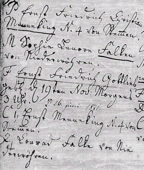 oo Obernkirchen, Niedersachsen, Deutschland 07.12.1809 Catharine Sophie Eleonore Falke, † Stemmen Nr. 4, , Deutschland 15.05.18633 Kinder von Nr. 17 18. Menneking, Ernst Friedrich Gottlieb, Anerbe zu Nr.4 in Stemmen, * Stemmen, Niedersachsen, Deutschland 19.11.1810, ~ Obernkirchen, Niedersachsen, Deutschland 25.11.1810, † Stemmen, Niedersachsen, Deutschland 26.06.1871